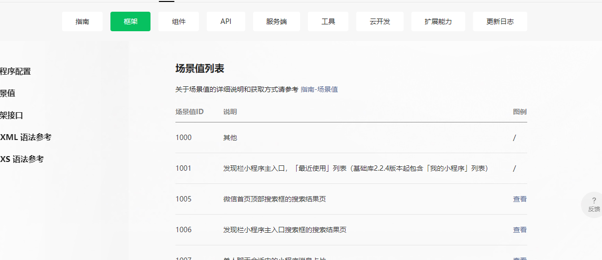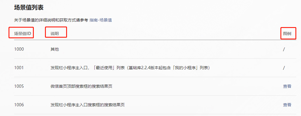 查询路径:微信官方文档 —— 小程序 —— 开发 —— 框架 —— 场景值 ——场景值列表(包含场景值ID、说明、图例查看)