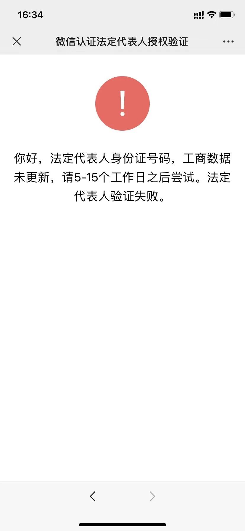 刚开始已经是工商局那边没有更新,所以当时就联系当地工商局,工商局那边回复已经给我人工手动更新同步了,但是在提交公众号认证的时候这几天依然一直提示法定代表人身份证号码,工商数据未更新,请5-15个公众日之后再尝试。我都已经弄十多天了