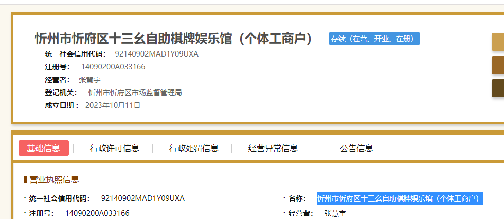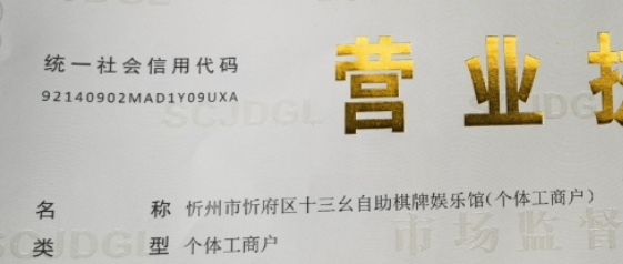 忻州市忻府区十三幺自助棋牌娱乐馆(个体工商户) 复制公示系统的名称也是不可以,不清楚名称哪里错了,辛苦明示下
