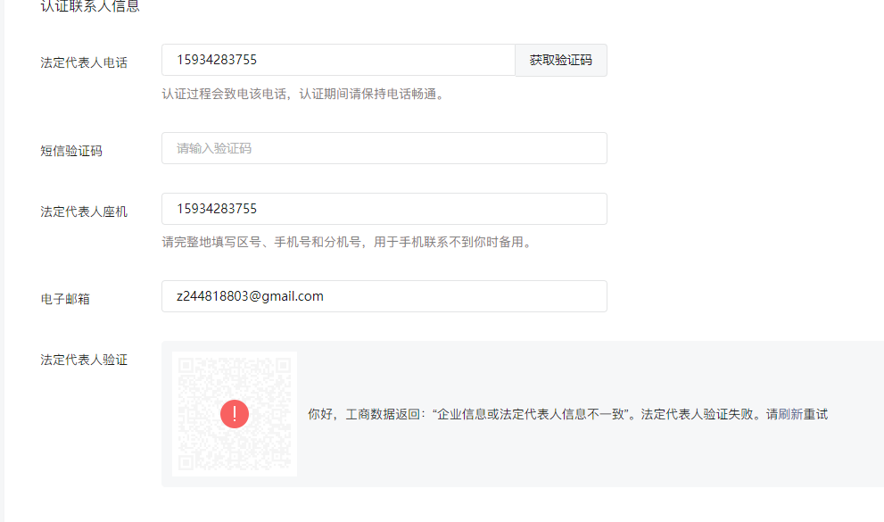 2023年4月18日注册的营业执照,已经几个月了,还是提示工商数据返回 :“企业信息或法定代表人信息不一致”。法定代表人验证失败?