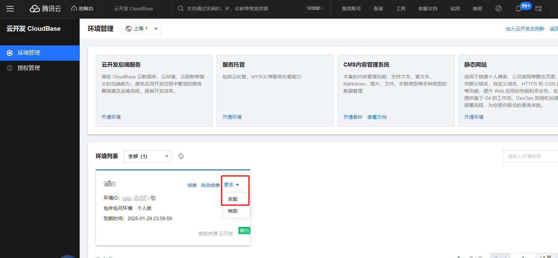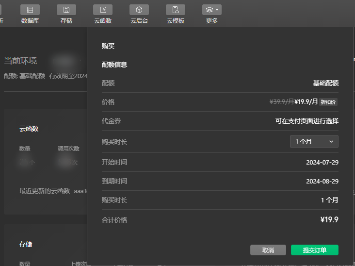 请教一下,云开发,现在是用的基础配额,19.9元/月,不够用了,怎么调整这个套餐,入口在哪儿呢,没找到呢?感谢解答!