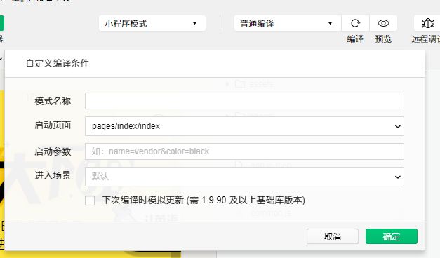 在编译模式中填写启动页面,启动参数和进入场景
