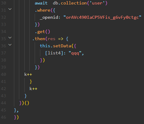 为了遍历数据表内所有数据的某个字段(数组),需要使用两个for循环,循环内要查询数据库,为了保证数据库查询出来的值都能setdata,又加了async,await实现同步,导致整体运行速度很慢,一共50条数据,大概运行了5秒