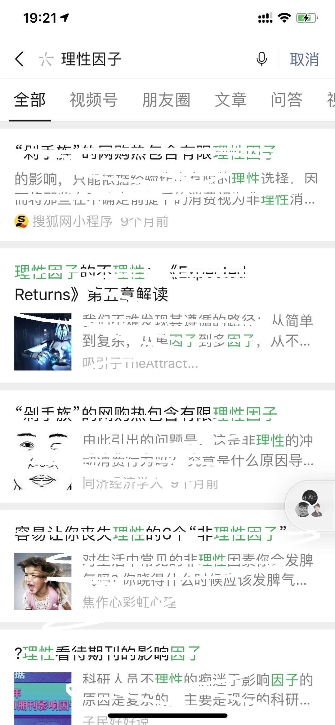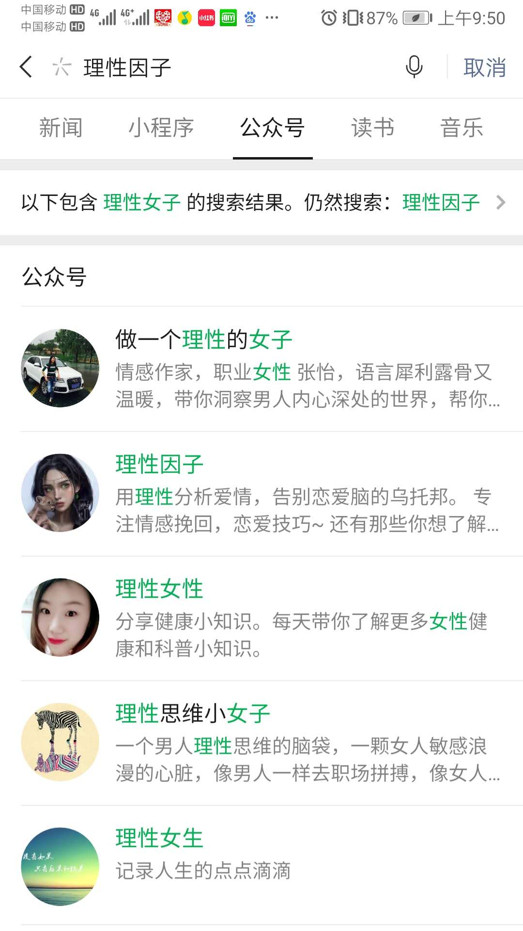 刚试了下,所有搜索找不到,切到公众号的时候,会有个提示“以下包含 理性女子 的搜索结果。仍然搜索:理性因子”,点这个仍然搜索,就能搜到你的公众号了。