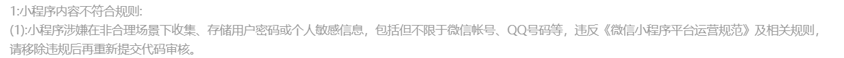 最近提审总是通不过,不知道什么叫非合理场景下收集,我看别人也是那样做的好好的,什么意思啊,第一次我以为是因为没有配置用户隐私保护,配置了,然后让用户添加收款银行账号什么的又不行,然后又在添加银行的页面增加了隐私保护说明等还是不行,能不能说清楚的点,说非合理场景,为什么不合理了?该小程序是人力资源服务公司,很多驻厂工人工资结算等是由人力资源服务公司进行工资发放的,如果不让用户提交银行账号将要如何支付呢?请解释下什么叫“小程序涉嫌在非合理场景下收集、存储用户密码或个人敏感信息”,我已经快疯了,凭什么不合理了????