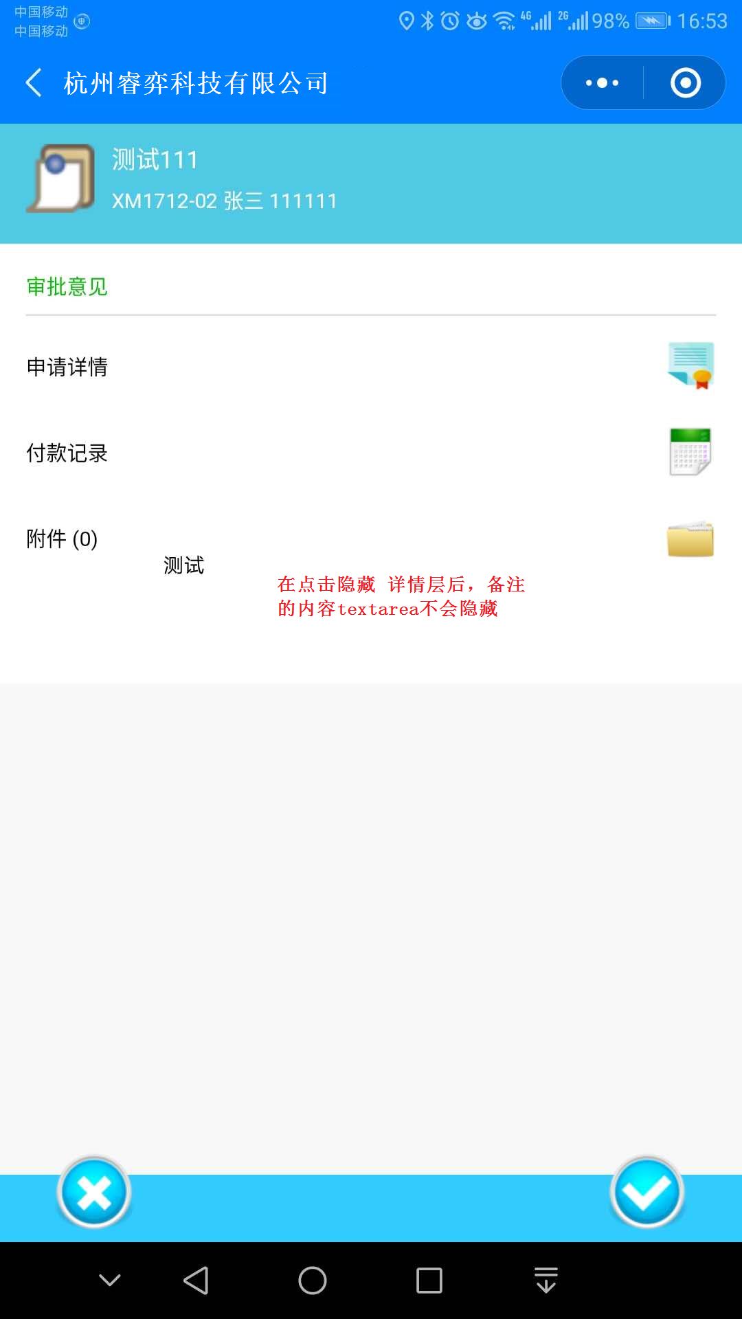 当对最外层进行隐藏后,textarea不隐藏,在开发环境下不存在问题,在手机端(mate9\iphone6)上都有此问题。