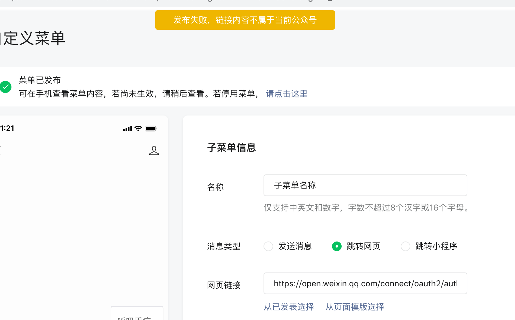 目前个人公众号菜单不支持跳转到外部链接,只能输入与公众号相关的链接进行跳转,如公众号文章、公众号合集、页面模板。
