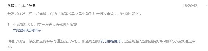 提审了一个微信小游戏,使用到【第三方游戏账号登录】,提审不通过。