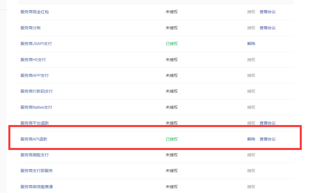 2)jsapi 和 api 退款权限,需要前往微信支付商户平台我的授权产品中进行确认授权
