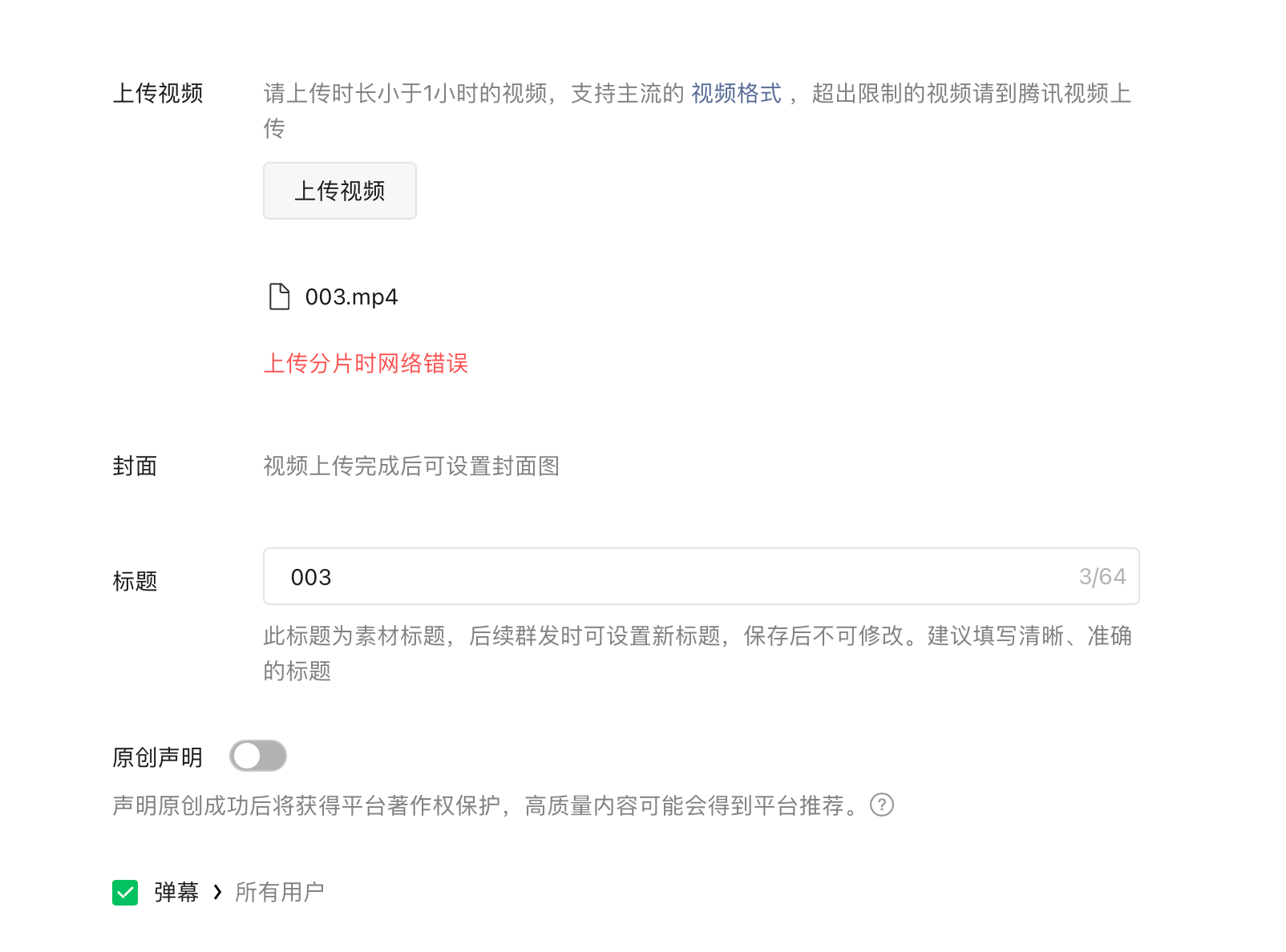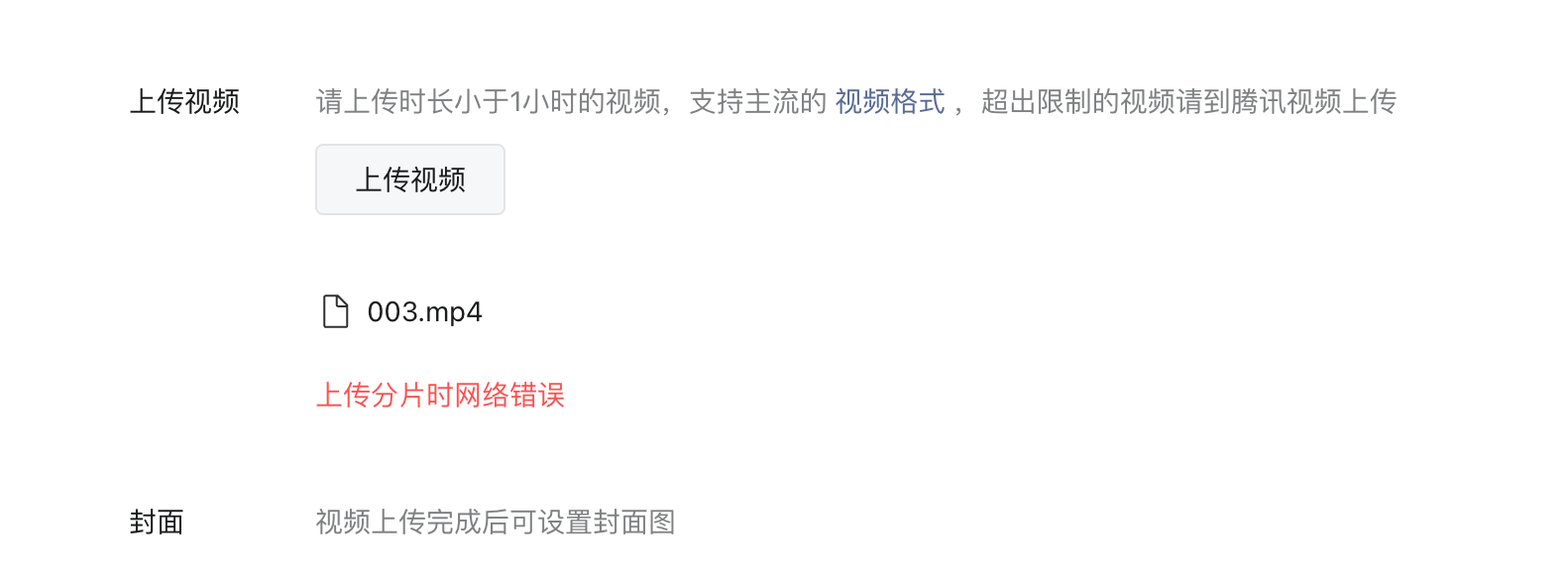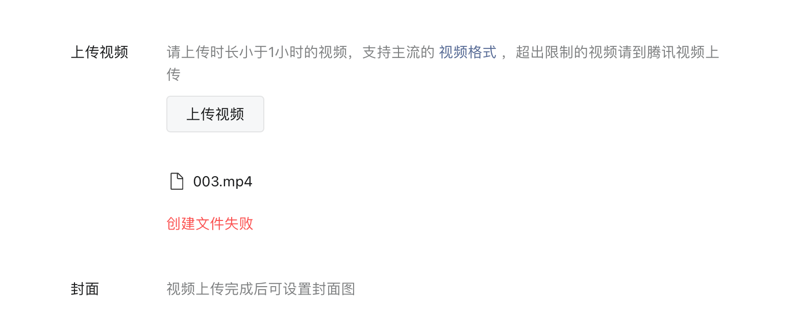 后台上传视频失败,两个浏览器,一个显示“上传分片时网络错误”,另一个显示“创建文件失败”,一天了都没传上去。