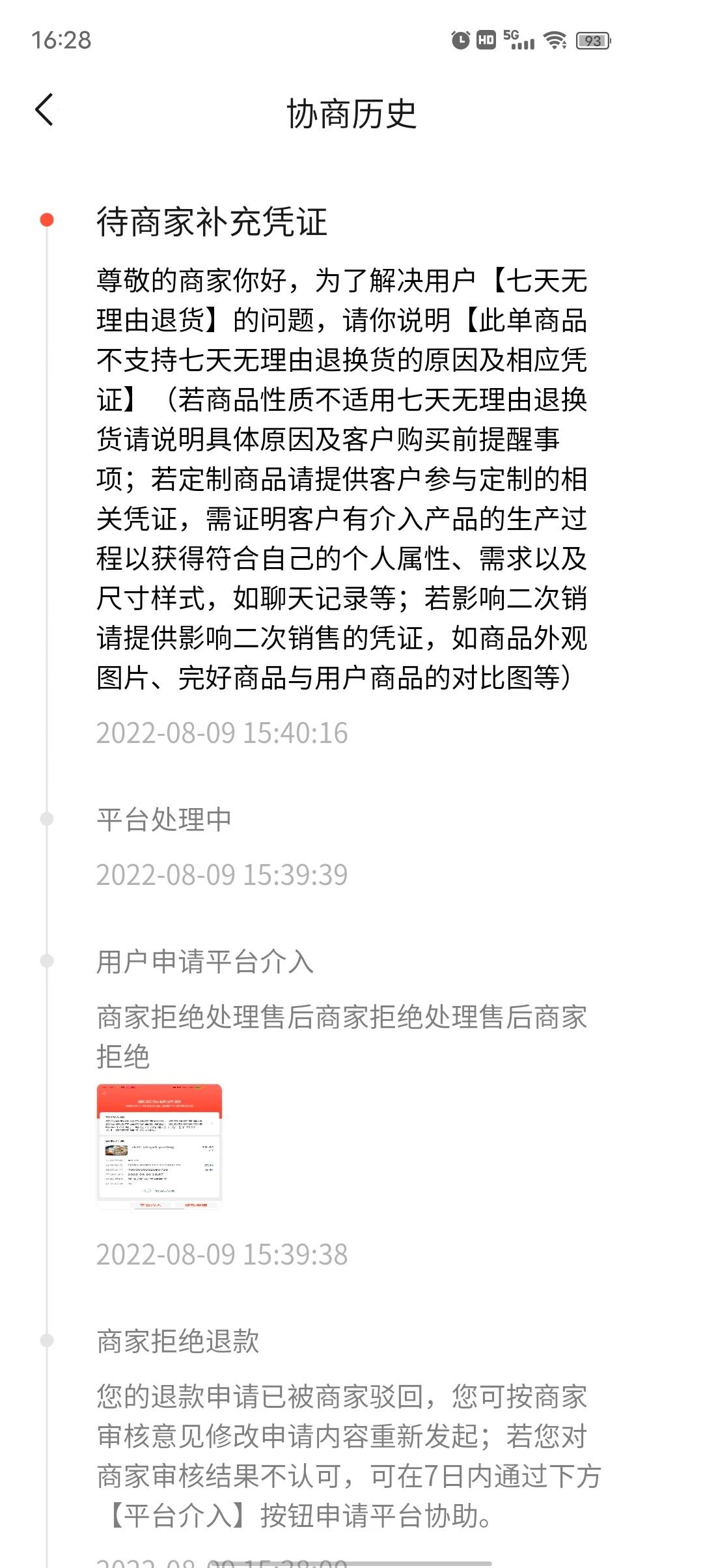 我们的测试订单确认收货后,申请售后退款,商家拒绝售后后,再申请平台介入,平台给用户的反馈截图如下