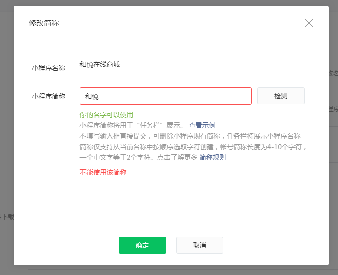小程序简称用 和悦 却提示不能使用该简称,麻烦帮忙看下原因