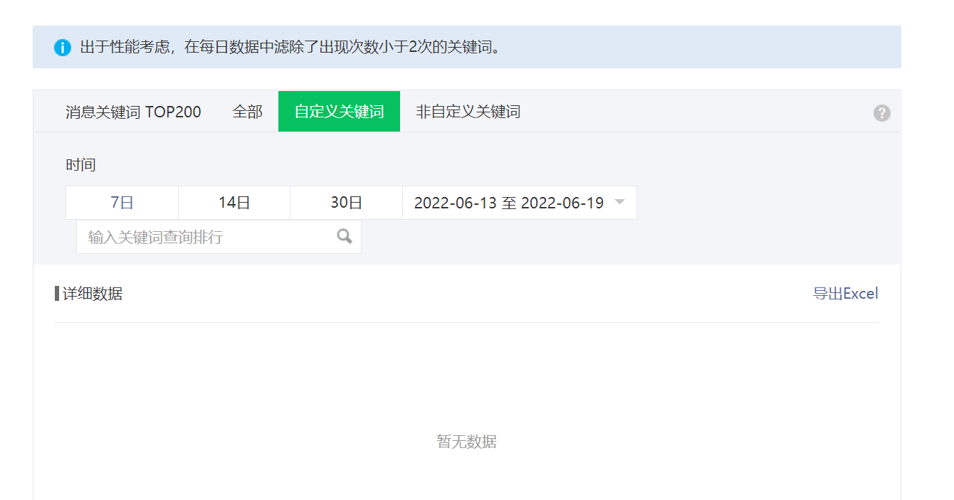 如图,已在后台设置关键词,近7天也有大于2次的出现,但是消息分析里面并没有数据,是什么情况呢
