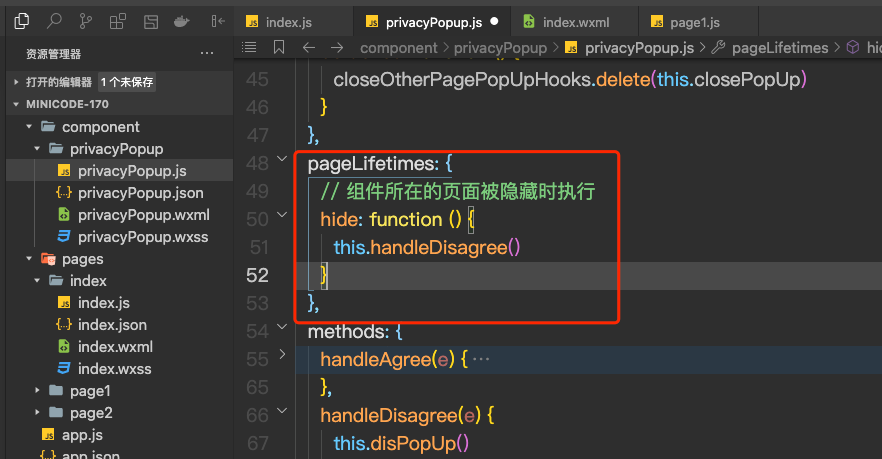 tabBarPageShow() { if (this.closePopUp) { privacyHandler = resolve => { privacyResolves.add(resolve) this.popUp() // 额外逻辑:当前页面的隐私弹窗弹起的时候,关掉其他页面的隐私弹窗 closeOtherPagePopUp(this.closePopUp) } } }