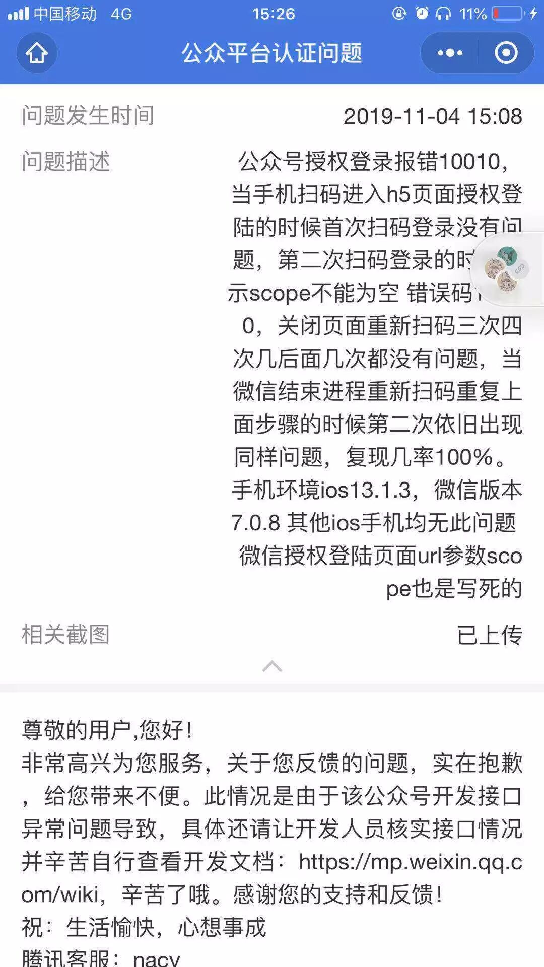 同一个二维码,指向微信授权登录,然后通过微信客户端扫一扫直接扫描这个二维码可以正常授权通过。但是如果通过扫一扫点相册里面的这个二维码识别去授权登录 就会提示scope不能为空 10010错误码。请微信工作人员尽快解决此问题并且给我一个合理的解释,贵公司这么多的高端人才,这么一个问题反馈上去十多天毫无进展没人联系,最后还要开发者自己帮你们找bug?颜面何在?