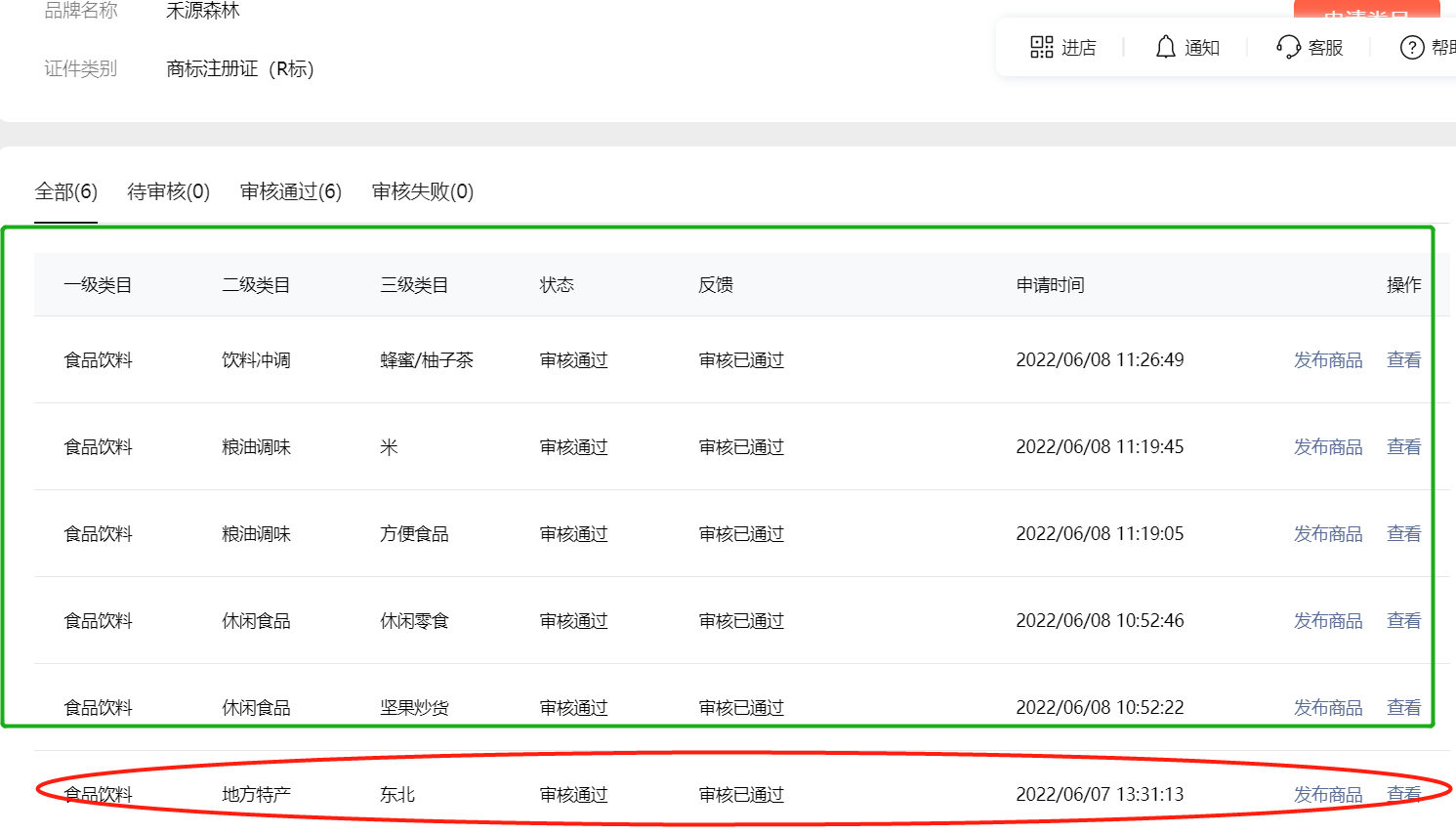 红色的是可以的显示品牌,绿色都显示无品牌,其它商标也是这样,只有最先申请的可以,后申请的都是无品牌
