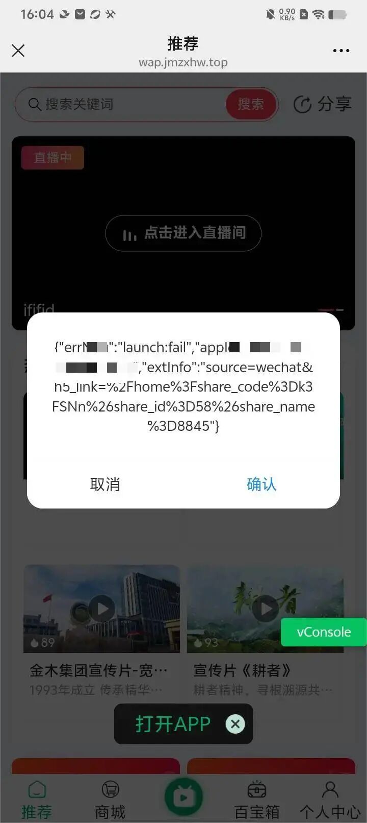 在安卓端通过wx-open-launch-app打开app,一报错launch:fail,找不到原因,复现地址https://wap.jmzxhw.top/home