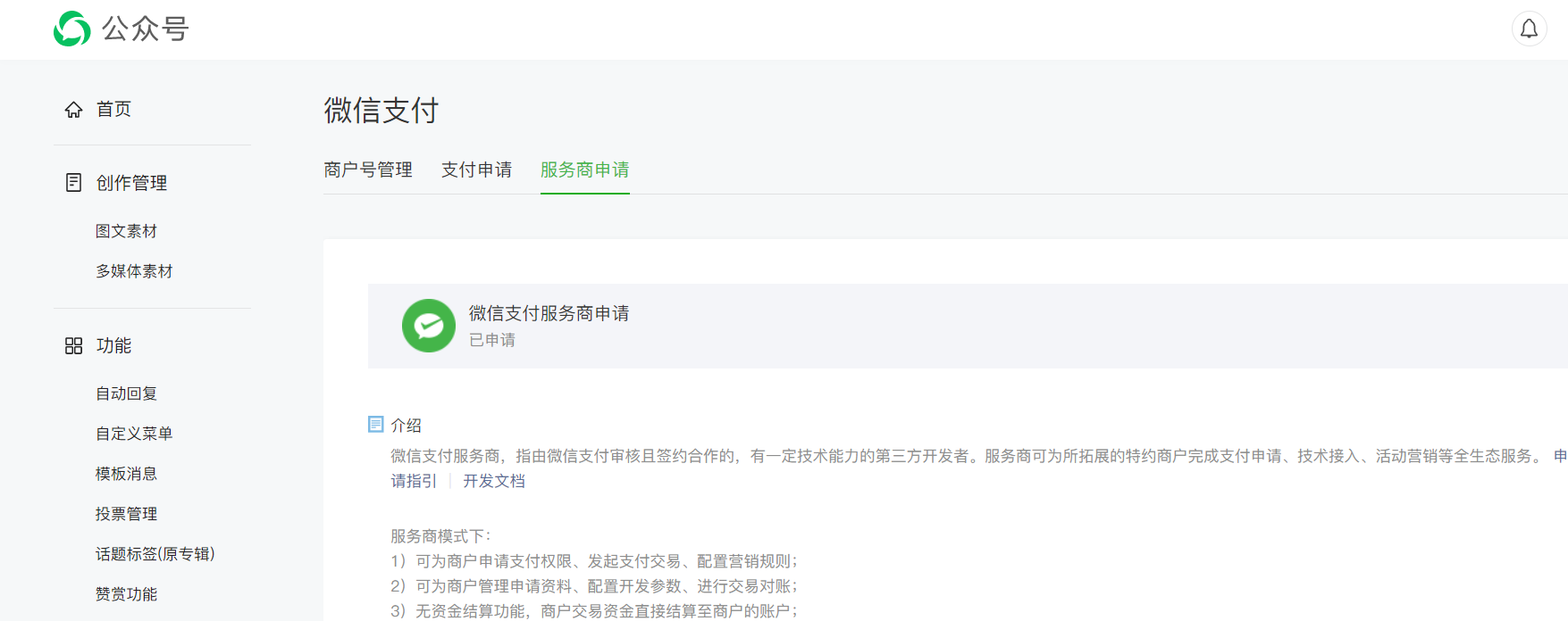 我们在微信公众号中已经开通了“微信支付服务商申请”如图: