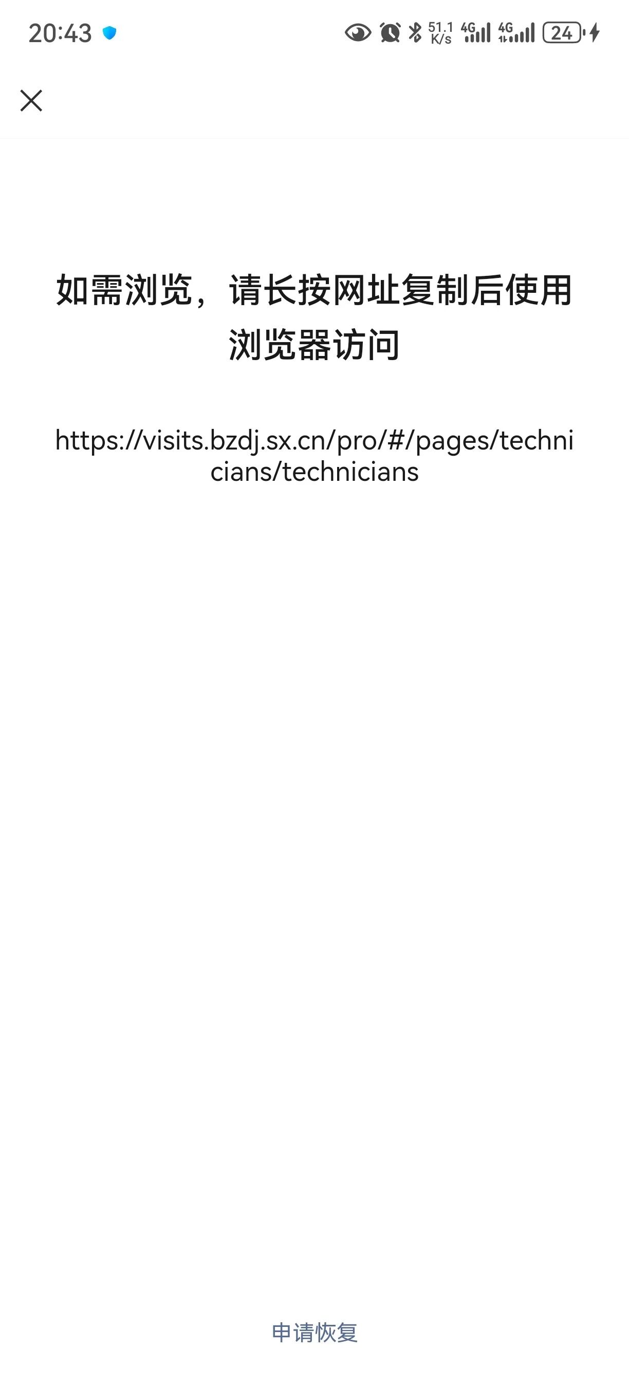 你好,经审核,域名【bzdj.sx.cn】下的链接【https://visits.bzdj.sx.cn/pro/index.html#/pages/technicians/technicians】的内容存在违反《微信外部链接内容管理规范》的第1条“诱导分享类内容”,请对相关内容修改后进行申诉;申诉方式可点击停止访问页底部入口进行操作,我们会在三个工作日处理,请耐心等待。