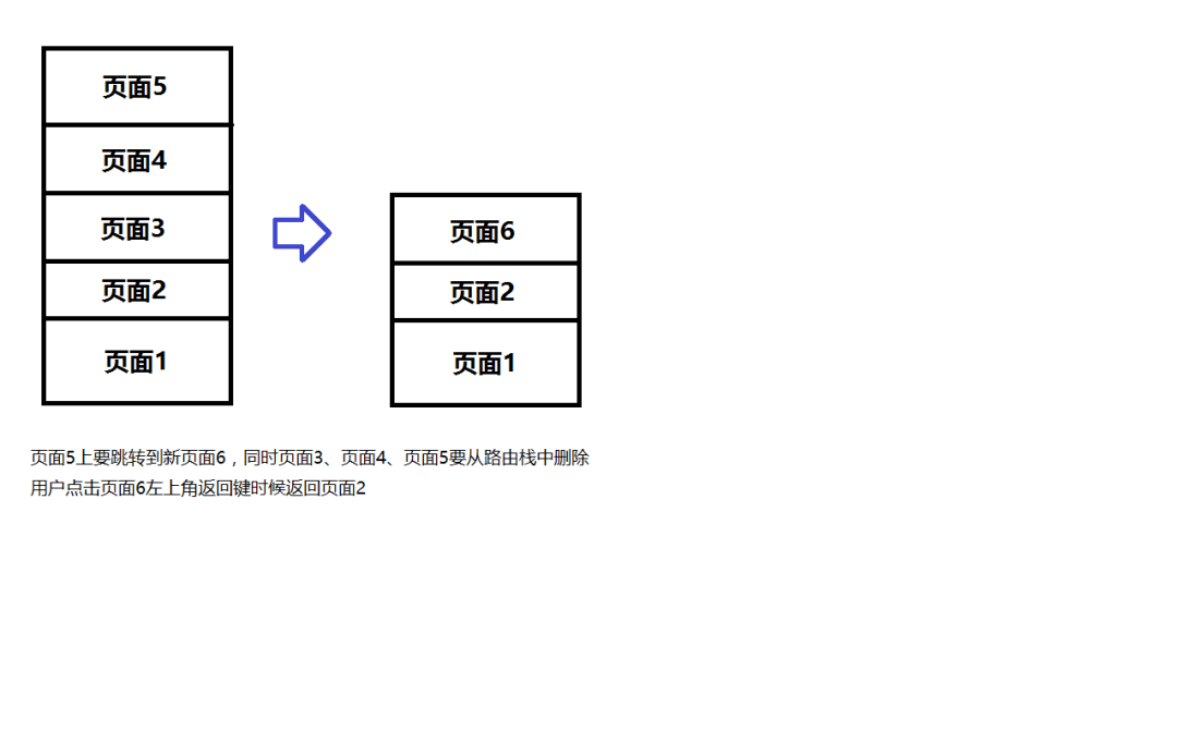 如图所示:用户在做完页面5的操作后,跳到新页面6,同时删除几个旧的页面,这样用户在页面6点击左上角的时候,就返回页面2