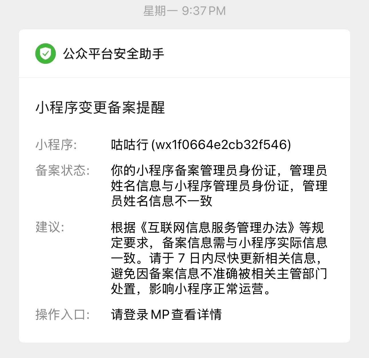 当小程序备案信息与小程序信息不一致时,小程序负责人未及时对小程序备案变更或注销,平台将采用警告、封禁小程序功能、强制注销小程序备案对小程序进一步处置,请及时在【小程序管理后台-设置-小程序备案-变更】发起变更备案。