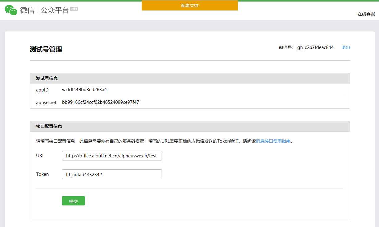 公众号测试号管理接口配置信息一提交就显示配置失败,怎么回事?