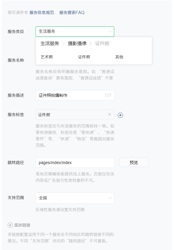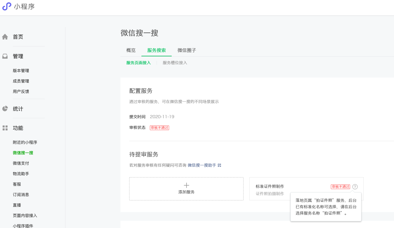 我选的是证件照类目,已经提审不下十次,每次都审核不通过,最开始提示的是服务名称没有意图,建议修改为“证件照制作”;