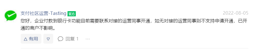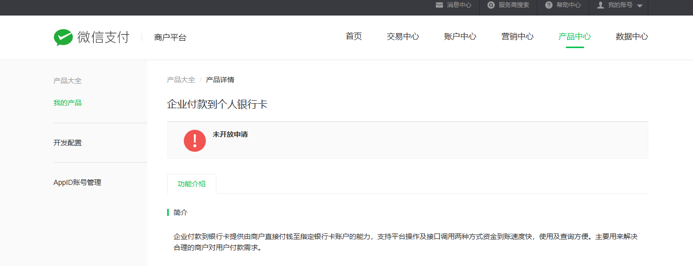 企业付款到个人银行卡 提示未开放申请