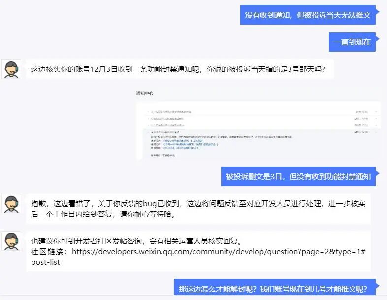 账号后台没有接到任何功能屏蔽通知,当天的素材侵权投诉已经成功申诉,但账号至今依旧无法推文。联系了后台客服说是bug,让到开发者社区发帖咨询