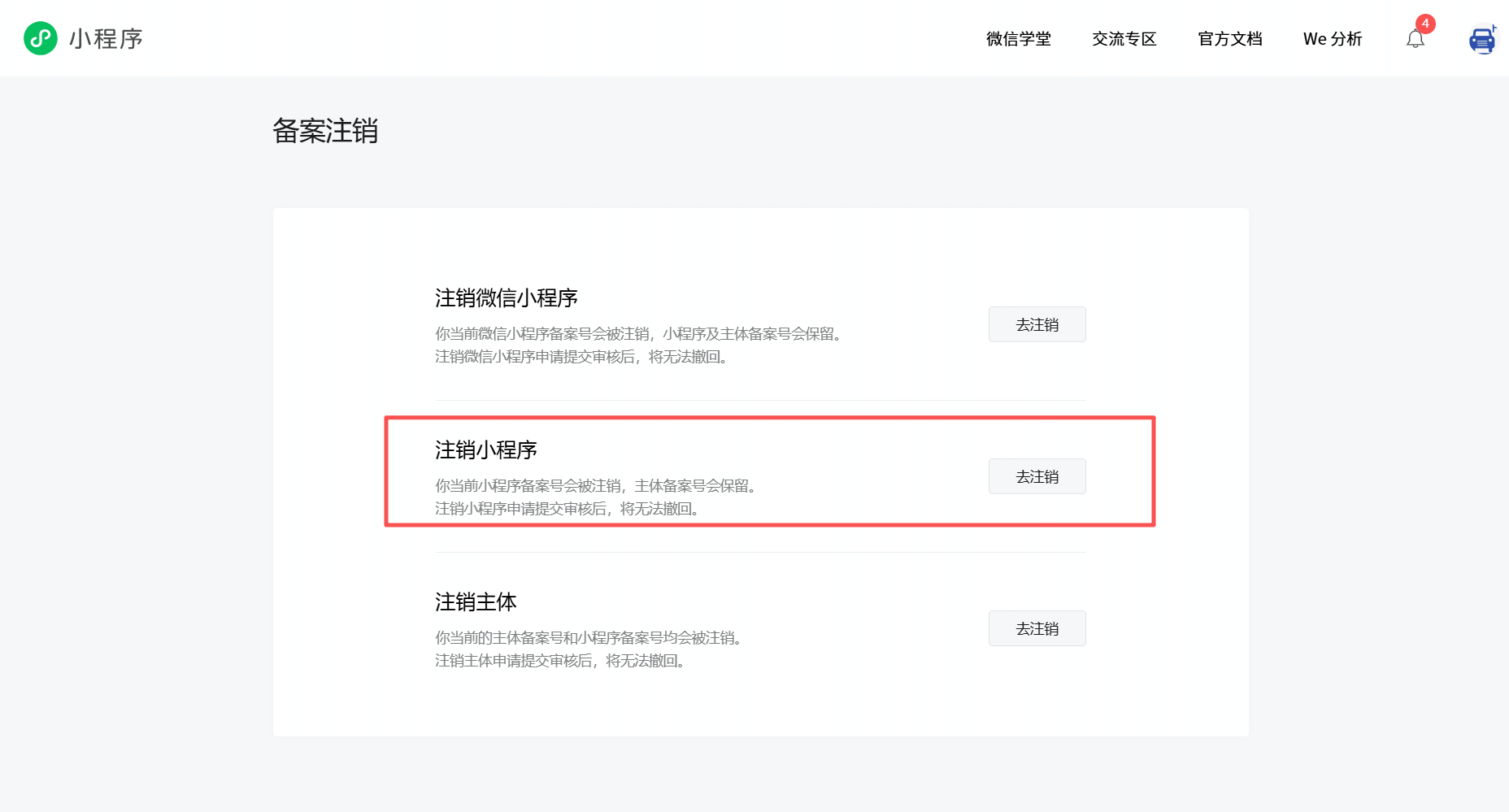 这个也是注销备案的一个选项。只会注销该主体下所有平台下同名小程序备案信息