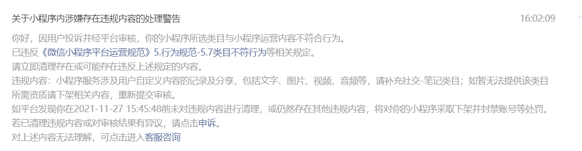 另外,我们的小程序用户类目不符的问题,我们还不熟悉类目申请规则,仔细看资料之后,我认为这是审核团队误判: