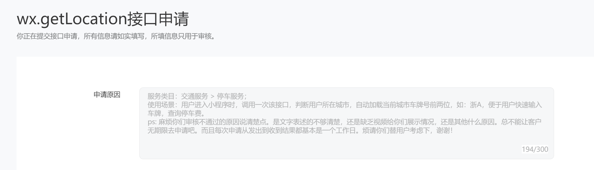 你好,根据你提交的申请原因可知申请wx.getLocation接口是用于【获取用户当前所在城市自动加载车牌号前两位】,不符合wx.getLocation接口使用场景开放范畴,建议可以使用chooseLocation或choosePoi实现上述场景。