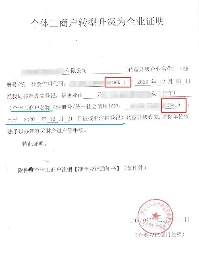 个体户升级有限公司有工商部门出具的《个体工商户转型升级为企业证明》如下图。