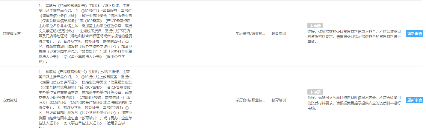 我们申请的教育培训-自媒体运营和文案策划这两个类目,已经按照要求提供了产品经营说明书和ICP的备案,但是审核不通过,提示“你好,你所提交的类目资质材料与申请该类目所要求的资质材料不一致,请提供该类目所要求的资质材料进行审核”,也没有具体说明哪个资质不符合,现在不知道下一步该怎么做了,求大神们指点