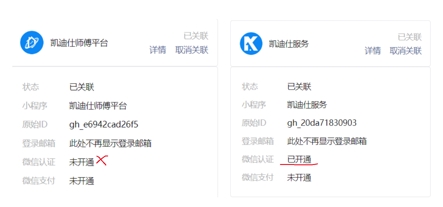但是突然要我的其中一个小程序(凯迪仕师傅平台)要操作认证,小程序 (凯迪仕服务)不用操作认证。怎么回事!!!
