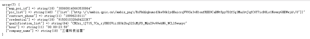 {"map_poi_id":"300608140663530864","pic_list":"{\"list\":[\"http:\\\/\\\/mmbiz.qpic.cn\\\/mmbiz_png\\\/RcPkQQqkumrd3ke56klydHaicrqVV9Sx3vH1onfREE9CaBNt5py7D2fSg3MaibtJqfC6Y7icB8Ls1NswxyGHEWwjA\\\/0\"]}","contract_phone":"18996218111","credential":"9150010328484223X7","qualification_list":"CN2zi_1J715_7Cn_rjUH0SVii1KOk2bqS2SiMjPD_MQzZ9v99ebNG_WCLl5wuxyc","hour":"00:00-23:59","company_name":"\u4e09\u5065\u79d1\u6280\u8fd0\u8425"}