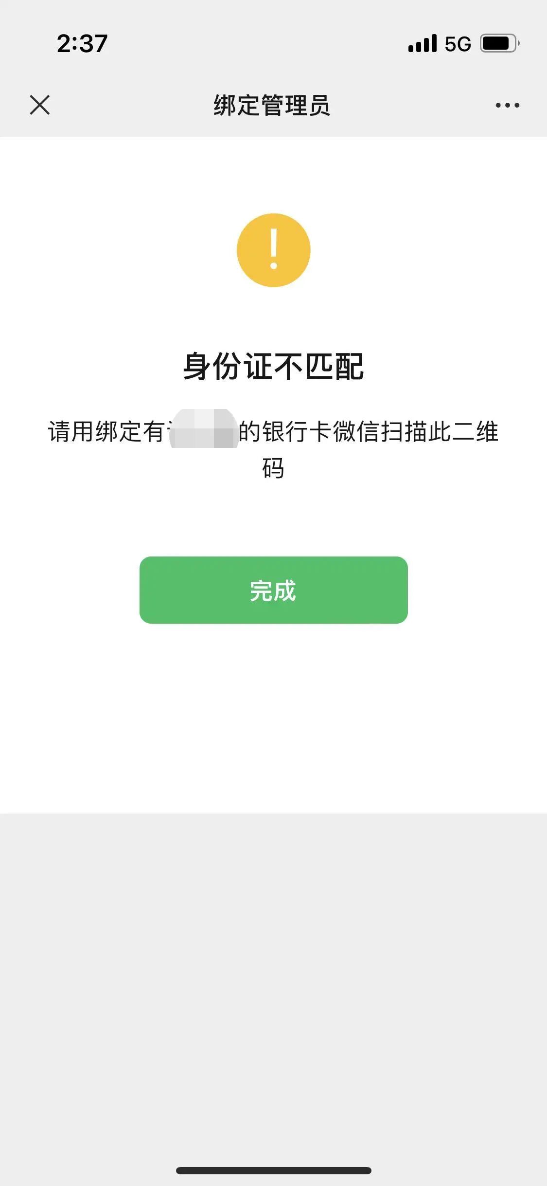 微信小程序想要换绑管理员,等到绑定新管理员这步执行的时候,新管理员扫码验证一直显示“身份证不匹配”。新管理员不在身边,只能远程扫码;新管理员微信认证确认是本人、银行卡也是自己的、实名的,这些信息都检查过了;再重新扫仍然显示“身份证不匹配”。有没有大佬指点下是怎么回事?