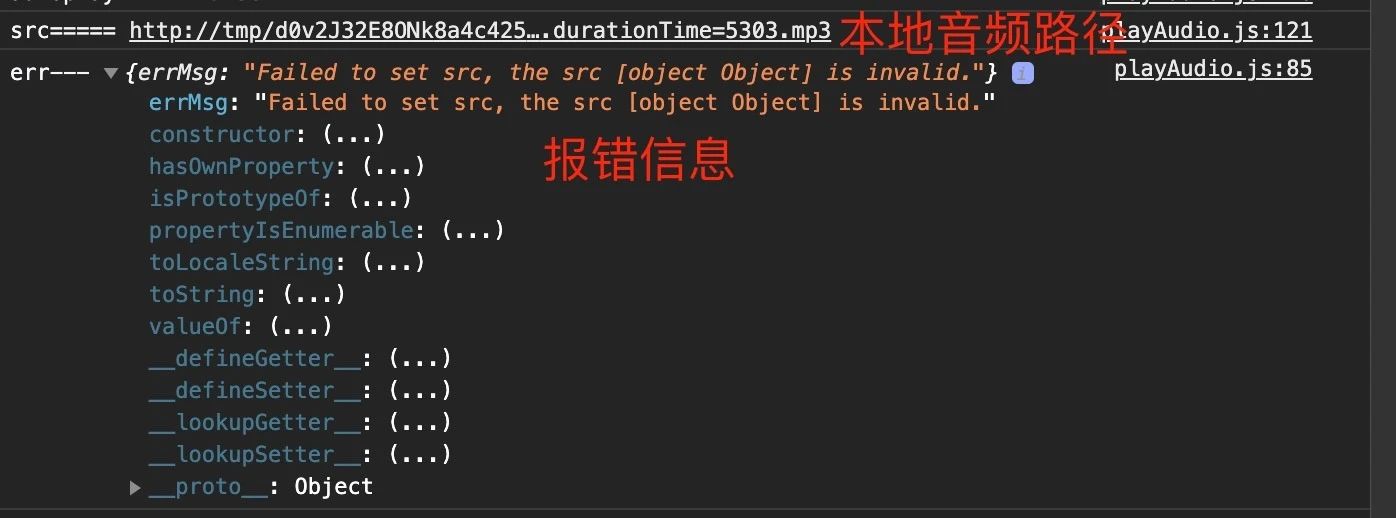小程序环境 wx.createInnerAudioContext() 设置已录制的本地音频为播放源时,提示报错,详情看如下截图,网络音频文件路径正常;