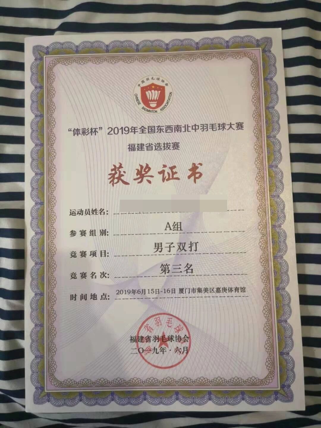 个人的话比较喜欢打羽毛球,是高中开始自学的,也拿过福建省高校杯团体第四、嘉庚杯高校邀请赛团体第四、东西南北中福建省选拔赛男双第三名的成绩。