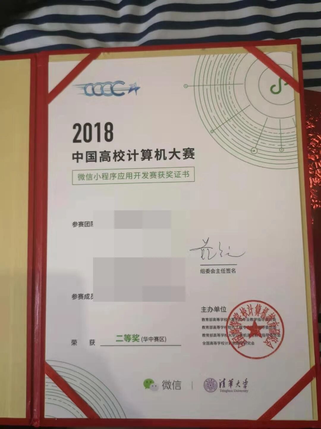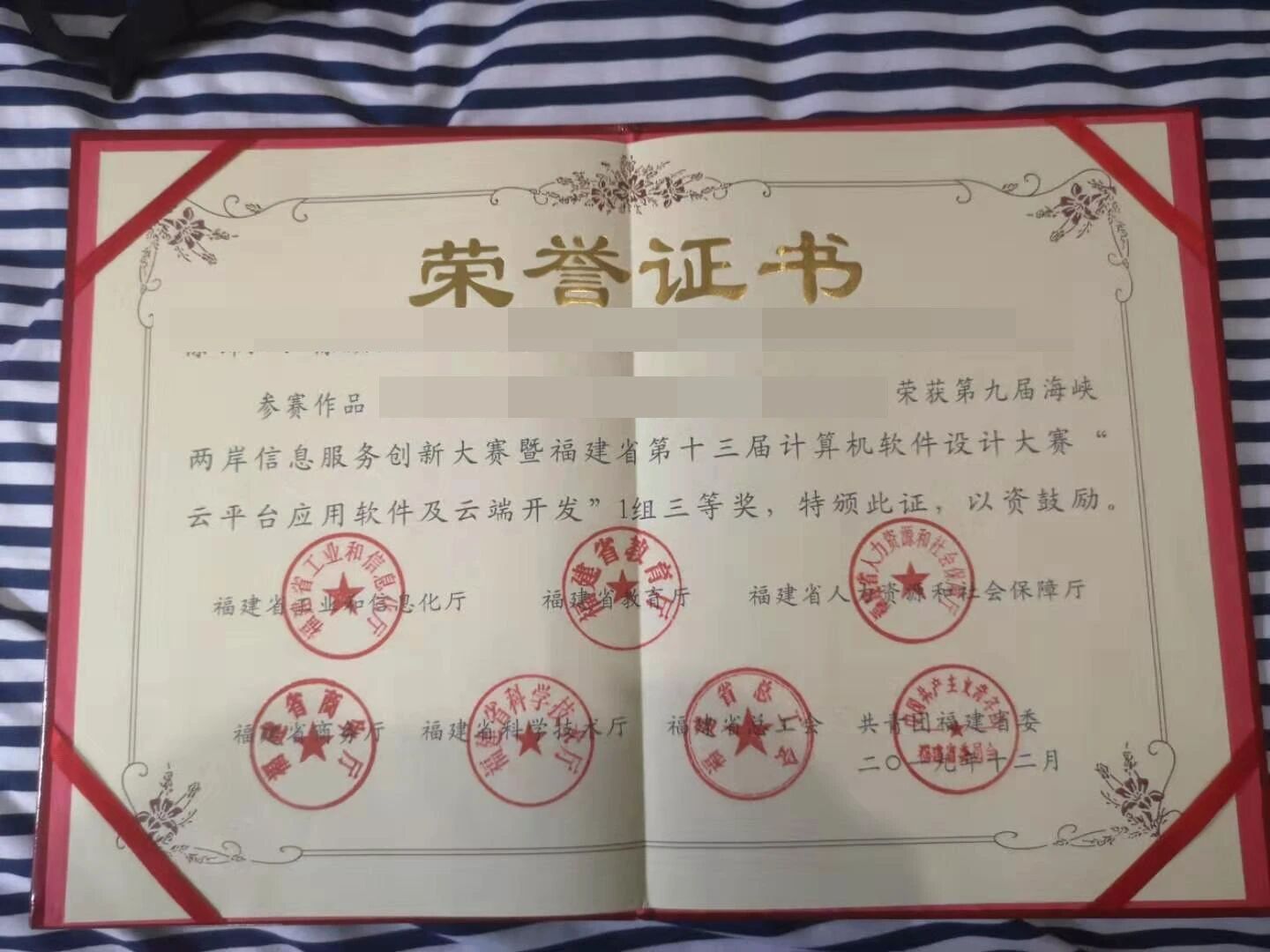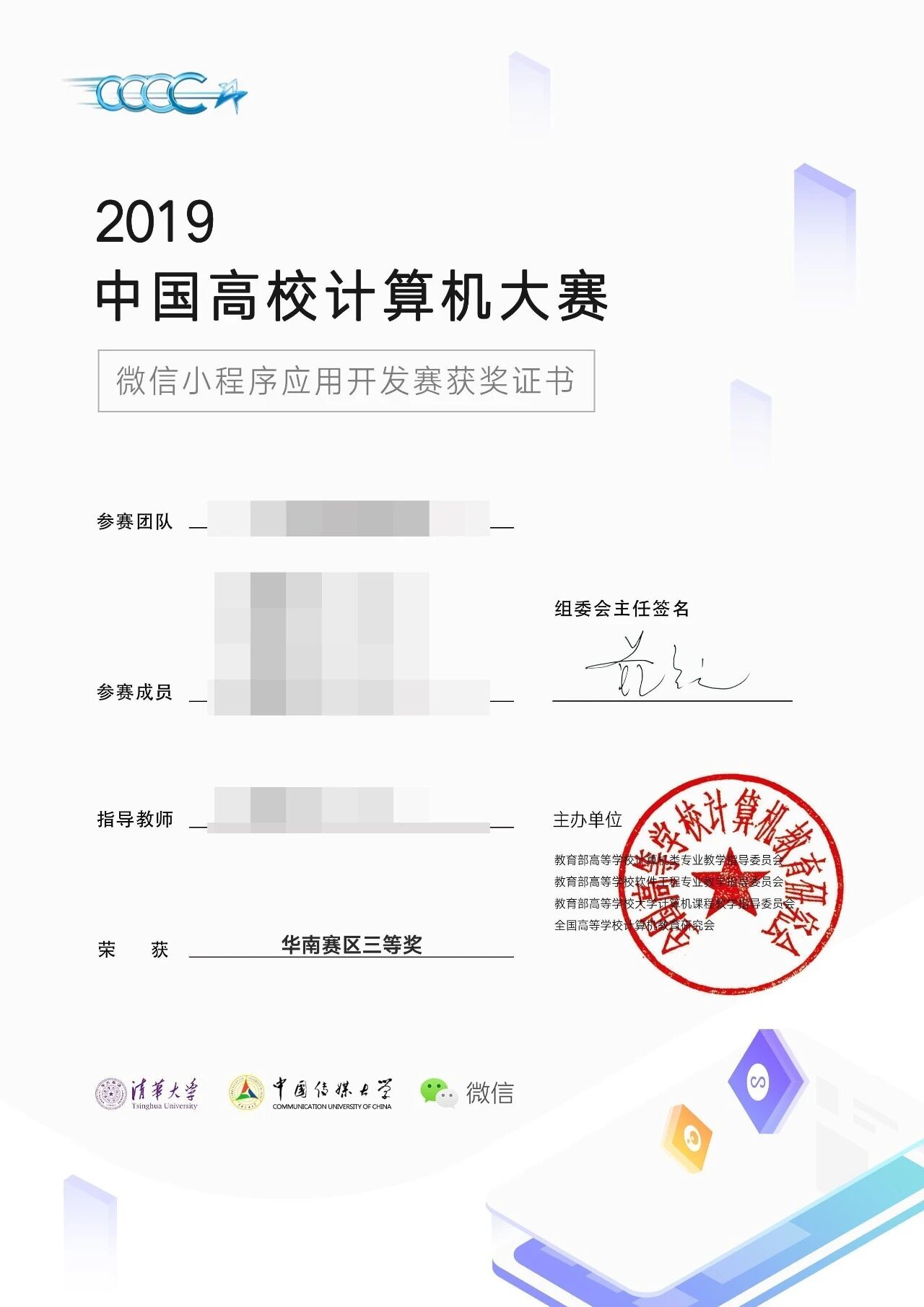 编程类的比赛大三之前其实不太乐意参加,因为有那时间不如接单。直到首届微信小程序应用开发赛出来,因为当时对小程序特别感兴趣,所以也就报名参赛了,最后组委会通知我们去华中赛区现场答辩,但是由于我在福建的原因,最后我们团队没有去答辩(挂名队长是华中赛区的,他要考研所以想当队长,临时组的队,创意、编码、甚至文字的80%都是我在做,结果他还很不负责,提交截止前搞失联),拿了华中赛区二等奖。第二年因为比较忙,所以拿了以前的一个作品参加了,拿了华南赛区三等奖,同时也拿了福建省软件设计大赛三等奖。