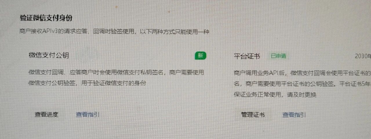 目前新申请商户号有平台证书和微信支付公私钥两种方案。微信支付公钥和平台证书都是用于v3版本接口的验签及敏感信息加密,公钥没有有效期,便于维护,建议使用公钥方案:https://pay.weixin.qq.com/doc/v3/merchant/4012153196