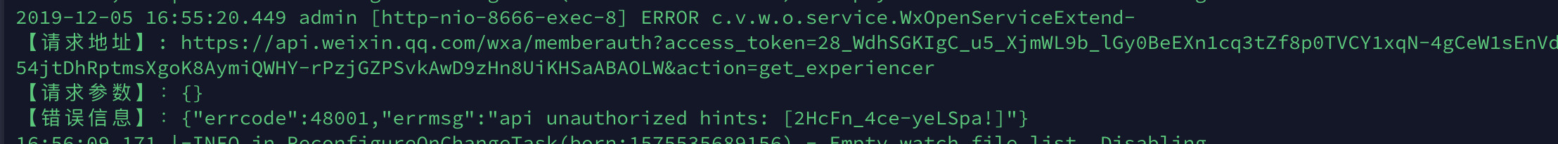 请求地址】: https://api.weixin.qq.com/wxa/memberauth?access_token=28_WdhSGKIgC_u5_XjmWL9b_lGy0BeEXn1cq3tZf8p0TVCY1xqN-4gCeW1sEnVd6fGMhB-uegEYh0FSuCsRMG15PIY_iHyPdKTJQEL54jtDhRptmsXgoK8AymiQWHY-rPzjGZPSvkAwD9zHn8UiKHSaABAOLW&action=get_experiencer【请求参数】:{} 【错误信息】:{"errcode":48001,"errmsg":"api unauthorized hints: [2HcFn_4ce-yeLSpa!]"