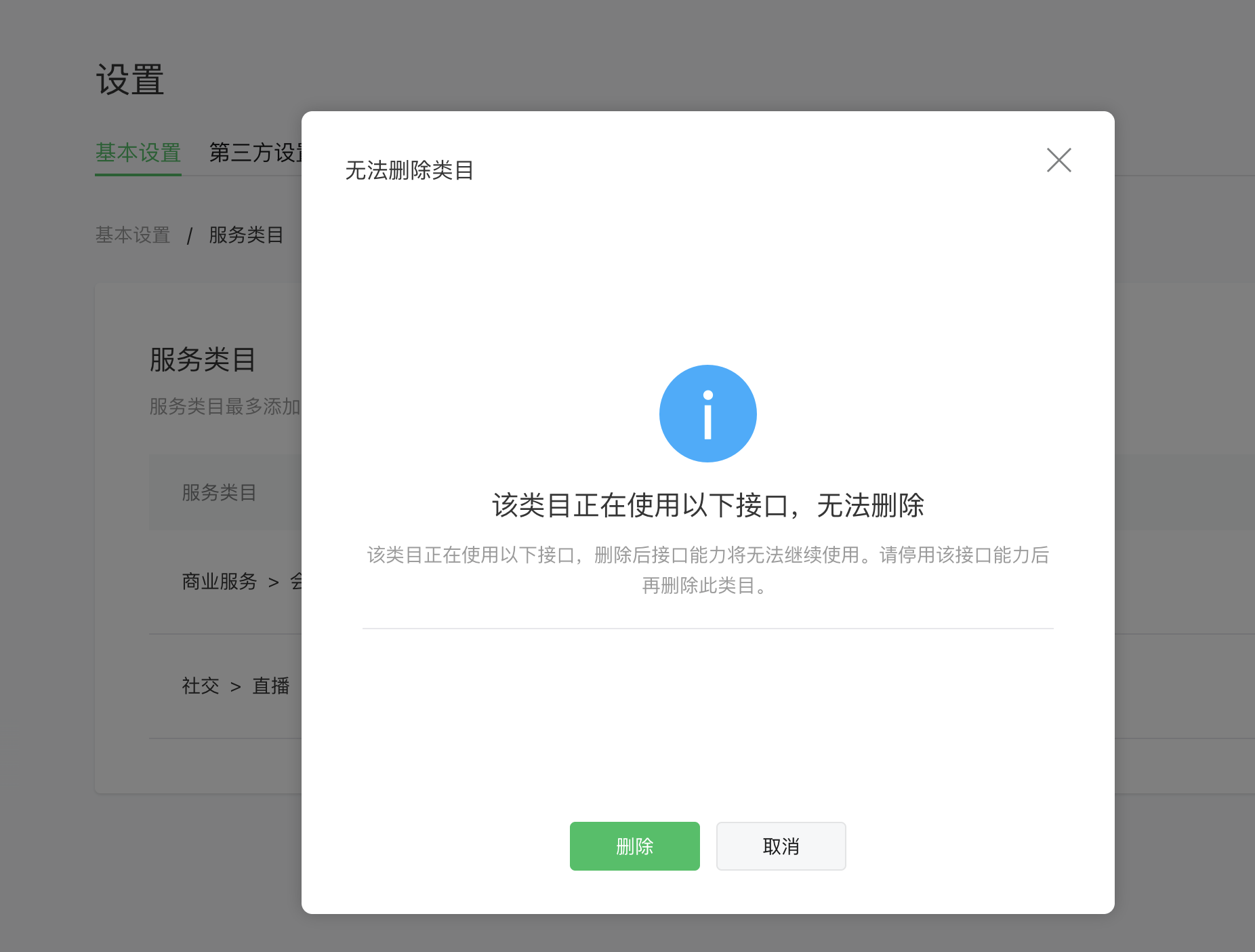 我想删除小程序设置的服务类目,提示我 该类目正在使用以下接口,删除后接口能力将无法继续使用。请停用该接口能力后再删除此类目。没用说明是哪个接口,检查代码也没有发现调用特殊api,怎么处理