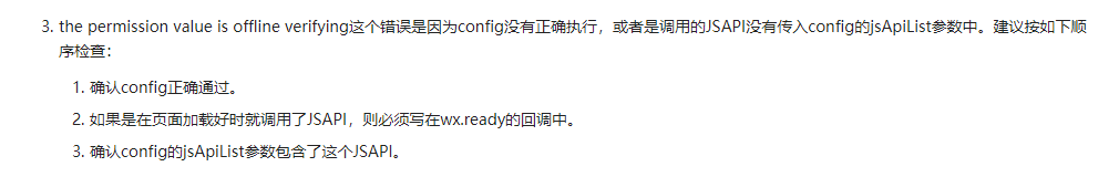 3、如果是在页面加载好时就调用了JSAPI,则必须写在wx.ready的回调中。如果是在页面初始化过程中就要调用,则可以通过使用发布订阅模式做判断,在需要初始化的页面中,先监听某个事件,然后等wx.ready之后,在其回调中主动触发事件。