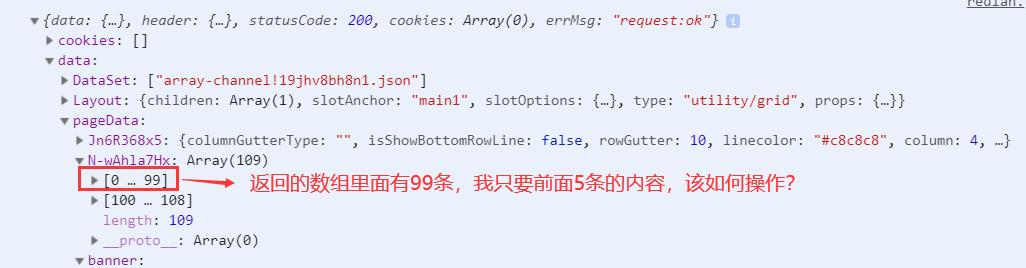 2.是在wxml上的wx:for通过wx:if="{{index < 5}}" 进行判断,让页面来判断只渲染下标为0,1,2,3,4的内容。达到你要渲染的页面效果。