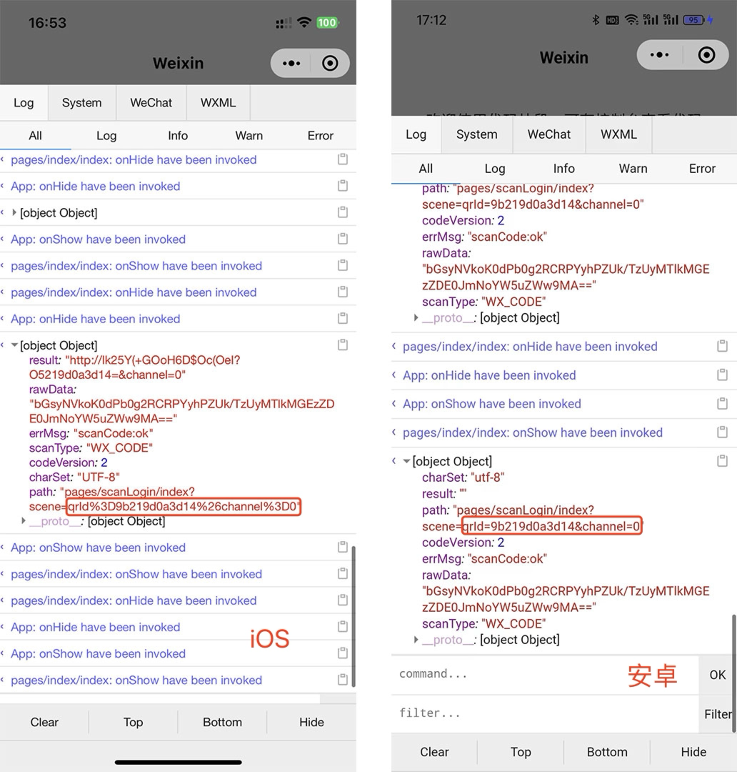 使用「wx.scanCode」接口扫描同一个通过「获取不限制的小程序码(getUnlimitedQRCode)」接口生成的小程序码:返回结果中的 path 属性,安卓将路径中的 scene 参数值 decodeURIComponent 处理了,和iOS不一致。