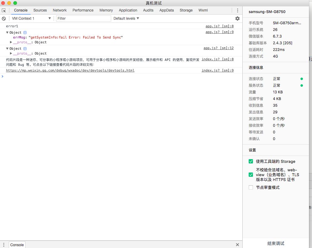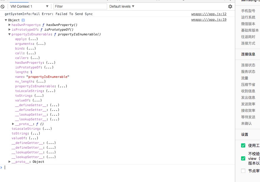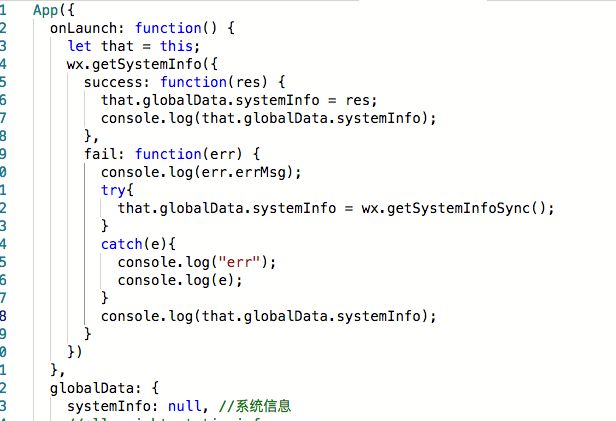 App({onLaunch:function() {wx.getSystemInfo({success:function(res) {console.log(res);},fail:function(err){console.log("error1");console.log(err);try{varsystemInfo = wx.getSystemInfoSync();console.log(systemInfo);}catch(err){console.log("error2");console.log(err);}}});}})有时就会出现这种情况