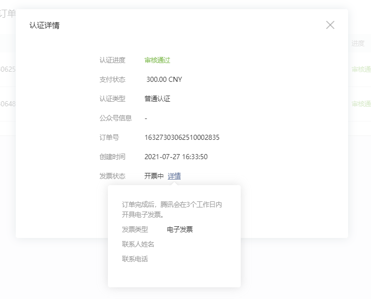 微信认证时,您可以勾选“增值税专票”或“电子发票”,选择发票类型并根据页面提示填写相应资料后,腾讯公司则会开具发票,邮费由腾讯公司承担。