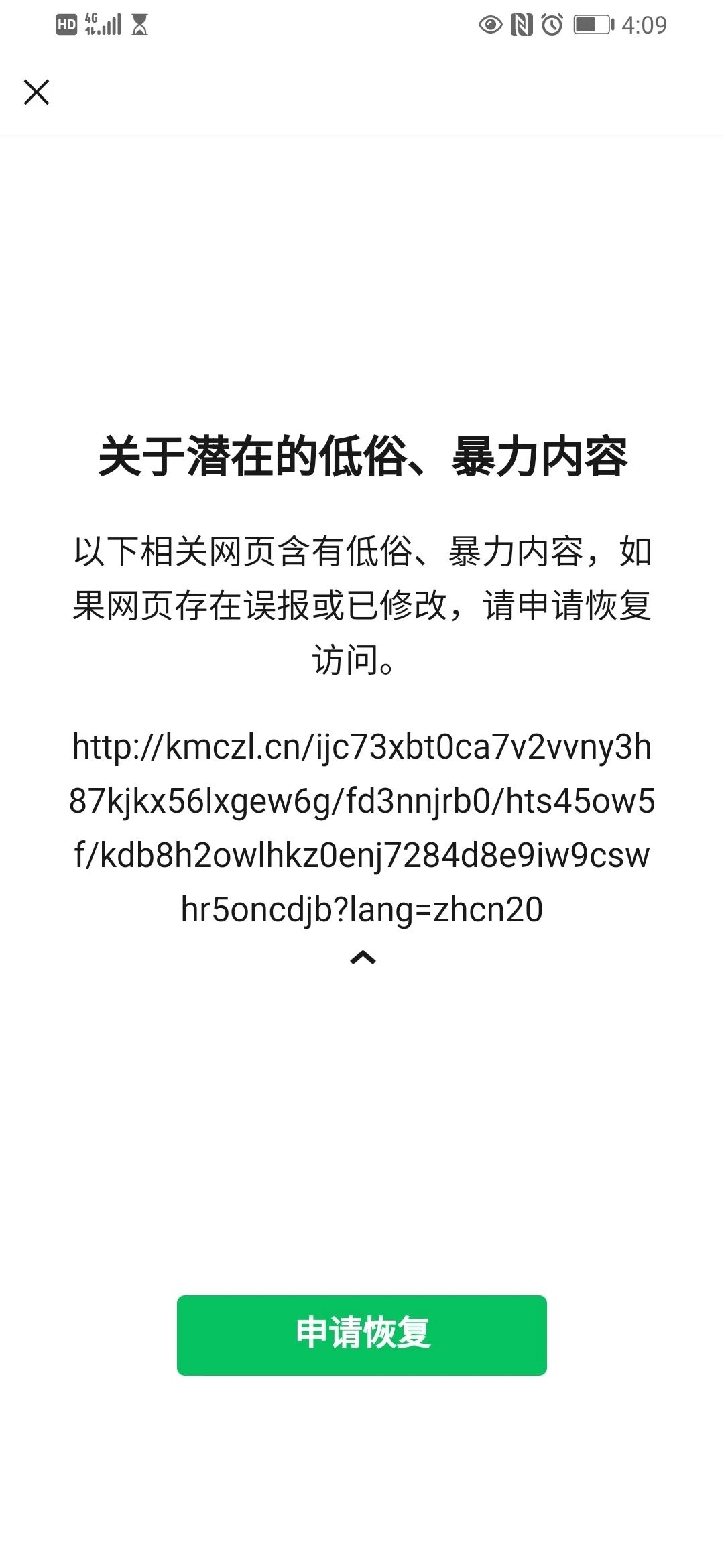 你好,经核实域名kmczl.cn下的链接【http://kmczl.cn/ijc73xbt0ca7v2vvny3h87kjkx56lxgew6g/fd3nnjrb0/hts45ow5f/kdb8h2owlhkz0enj7284d8e9iw9cswhr5oncdjb?lang=zhcn20】的违规内容已经修改,现已恢复微信内直接访问的服务,请知悉。