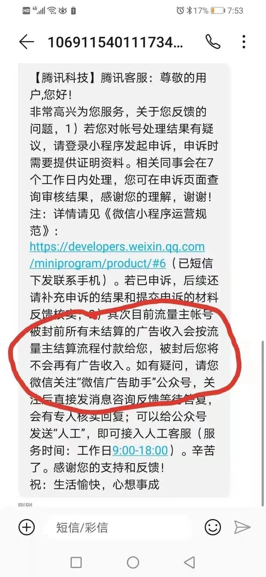 小程序封禁,关闭流量主权限可以理解。但是为什么只是小程序违规,就要把我整个月的钱都扣除?申诉